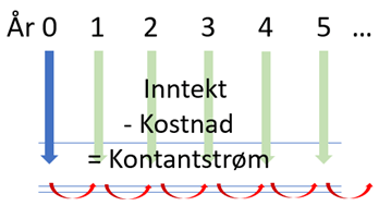 Kontantstrømmen bygges opp av rekken av «års-summer»: – investeringen + (inntekt – kostnad i år 1) + (inntekt – kostnad i år 2) + (inntekt – kostnad i år 3) osv. År 0 er investeringsåret. Om summen av rekka er positiv, betyr det at en har hatt større inntekter enn kostnader over den tidsperioden en ser på.